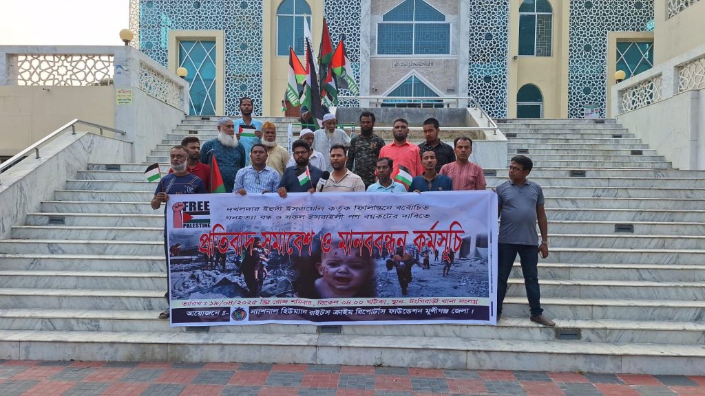 দখলদার ইহুদী ইসরায়েলি কর্তৃক ফিলিস্তিনে বর্বরোচিত গনহত্যা বন্ধ ও ইসরাইলি পণ্য বয়কটের দাবিতে প্রতিবাদ সমাবেশ ও মানববন্ধন করেছে ন্যাশনাল হিউম্যান রাইটস ক্রাইম রিপোর্টার্স ফাউন্ডেশন।